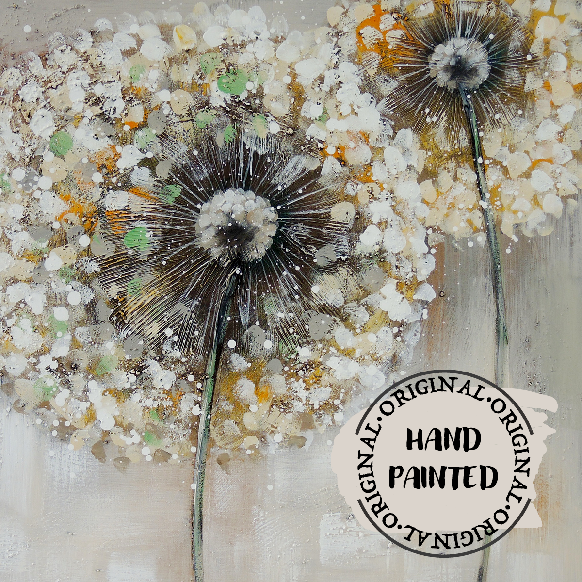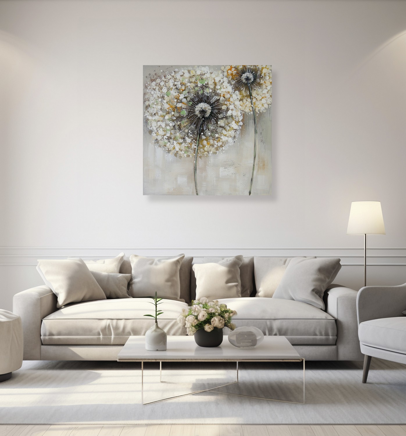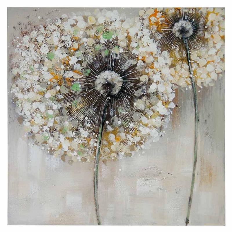 Tento ručně malovaný obraz na plátně v jemných bílo-šedých a lehce zlatých odstínech zachycuje křehkou krásu chmýří pampelišek. Paleta barev vytváří harmonickou, klidnou atmosféru, kde šedé a bílé tóny evokují pocit lehkosti a vzdušnosti, zatímco zlaté akcenty dodávají obrazu jemný třpyt a nádech elegance. Tento obraz je ideálním doplňkem pro interiéry, které touží po jemné, nadčasové estetice, která spojuje přírodní motivy s minimalistickým a sofistikovaným designem