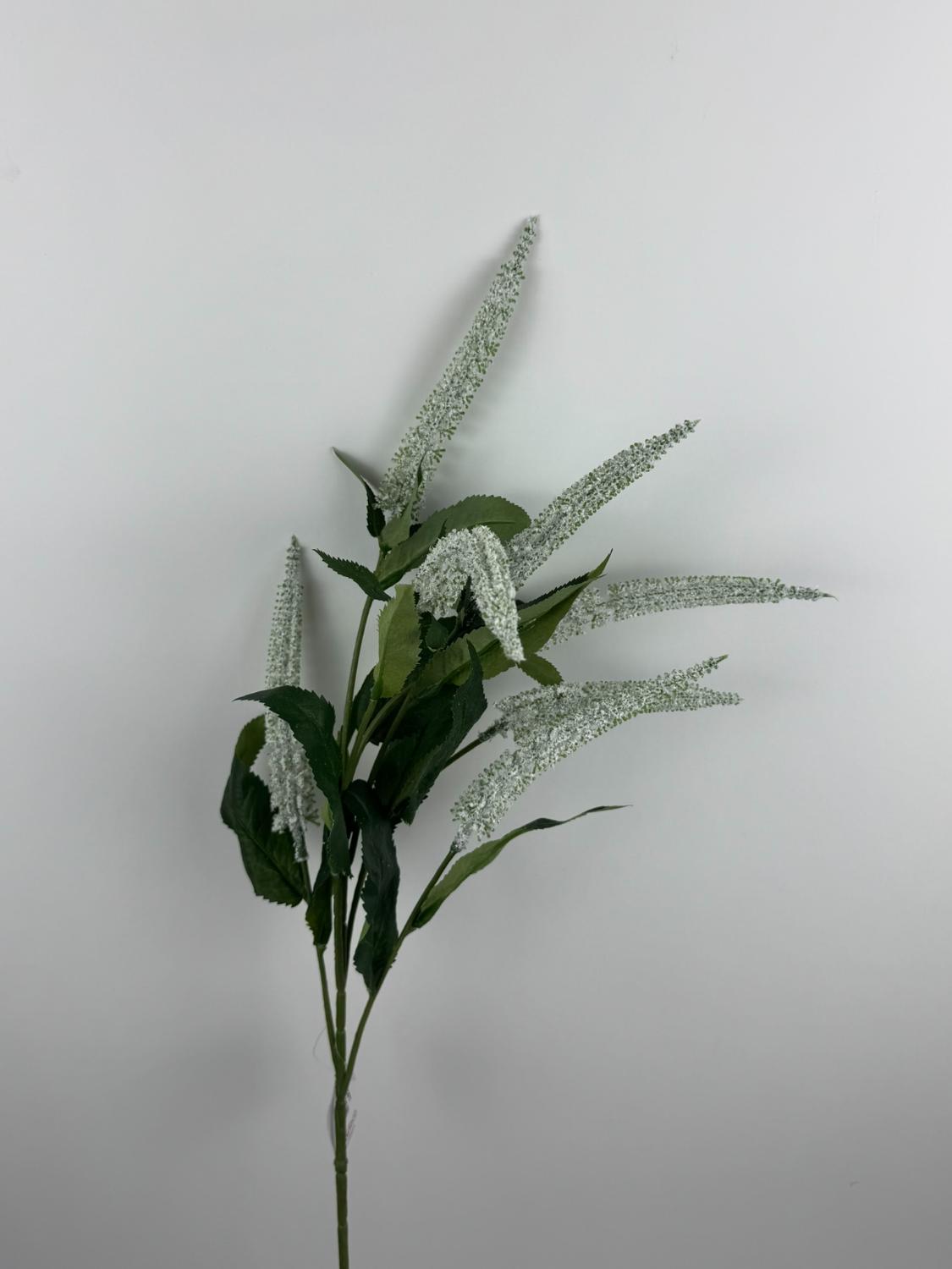 Umělá květina s bílými klasy a tmavě zelenými listy, ideální pro dekorační aranžmá. Přinese eleganci a styl do každého interiéru bez nutnosti údržby.
