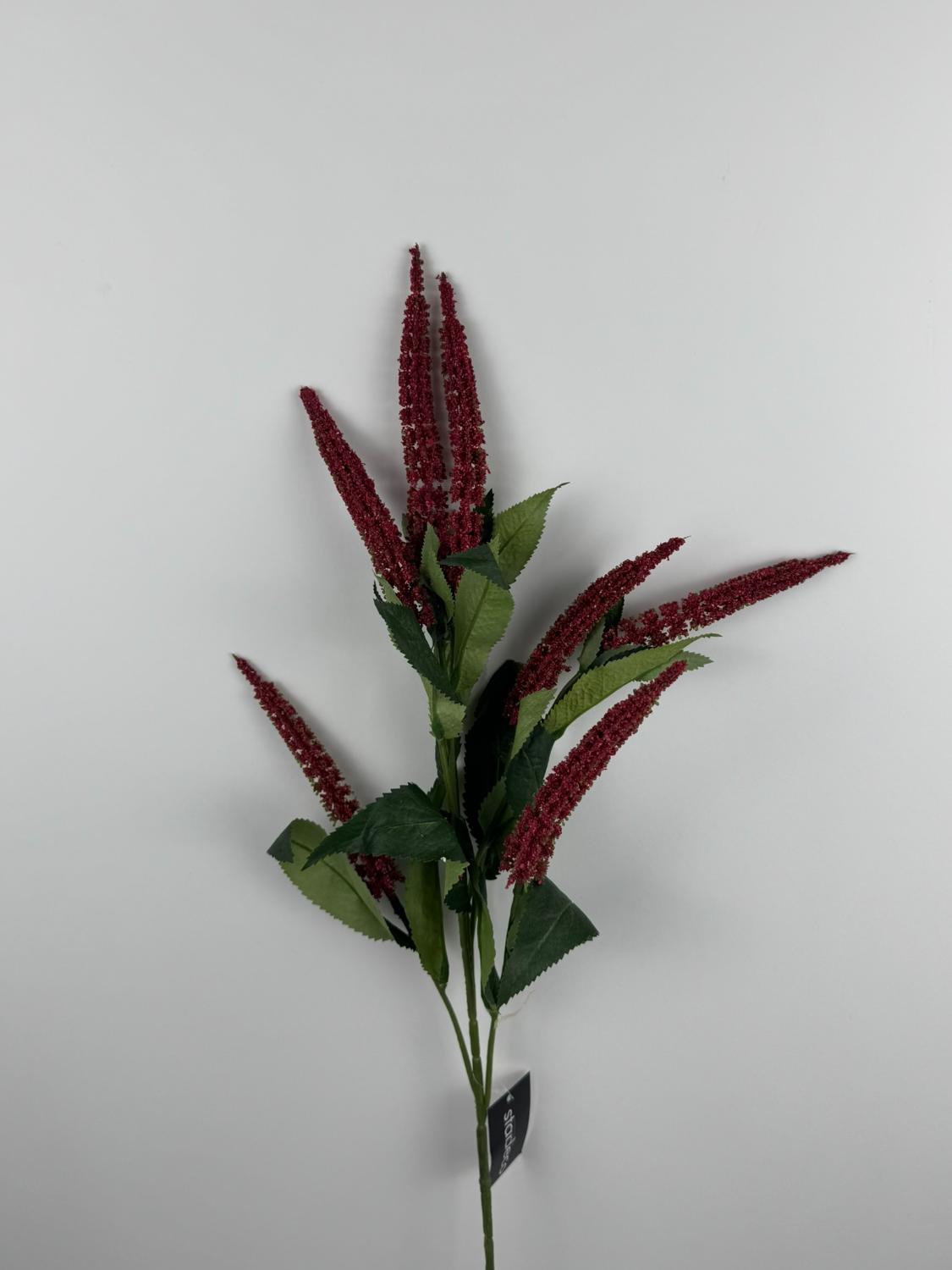 Umělá květina s vínovými klasy a tmavě zelenými listy, ideální pro dekorační aranžmá. Přinese eleganci a styl do každého interiéru bez nutnosti údržby.