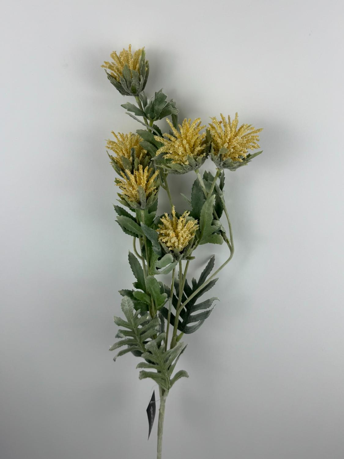 Umělá květina s žlutými květy a zelenými listy na vysokém stonku. Perfektní pro moderní a elegantní výzdobu interiéru, která nevyžaduje téměř žádnou údržbu.
