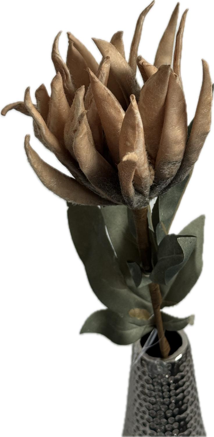 Tato umělá květina představuje unikátní dekorativní doplněk s přirozeným a zároveň moderním vzhledem. Květ je tvořen z jemně zatuchlých, světle hnědých okvětních lístků, které působí jako suché nebo odumřelé květy, a vytvářejí tak dojem elegance a jedinečnosti. Listy jsou v tmavší zelené barvě s matnou texturou, která dodává celku hloubku a autentičnost.