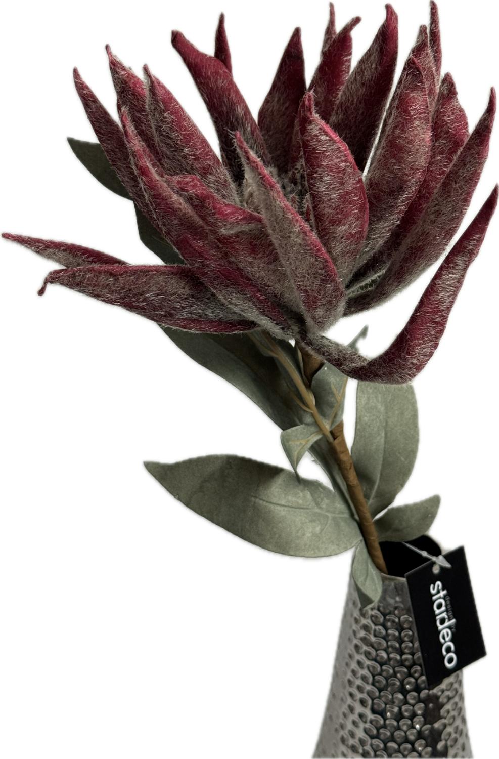 Tato umělá květina představuje elegantní a originální dekorativní doplněk, který do vašeho interiéru vnáší nádech přírodního kouzla. Květ má bohaté, jemně chlupaté okvětní lístky v sytých, tmavě růžových odstínech, které působí jako zavadlé nebo suché květy, a dodávají eleganci a rustikální charakter. Listy jsou v tlumené, matné zelené barvě, které dokonale doplňují celkový přirozený vzhled.