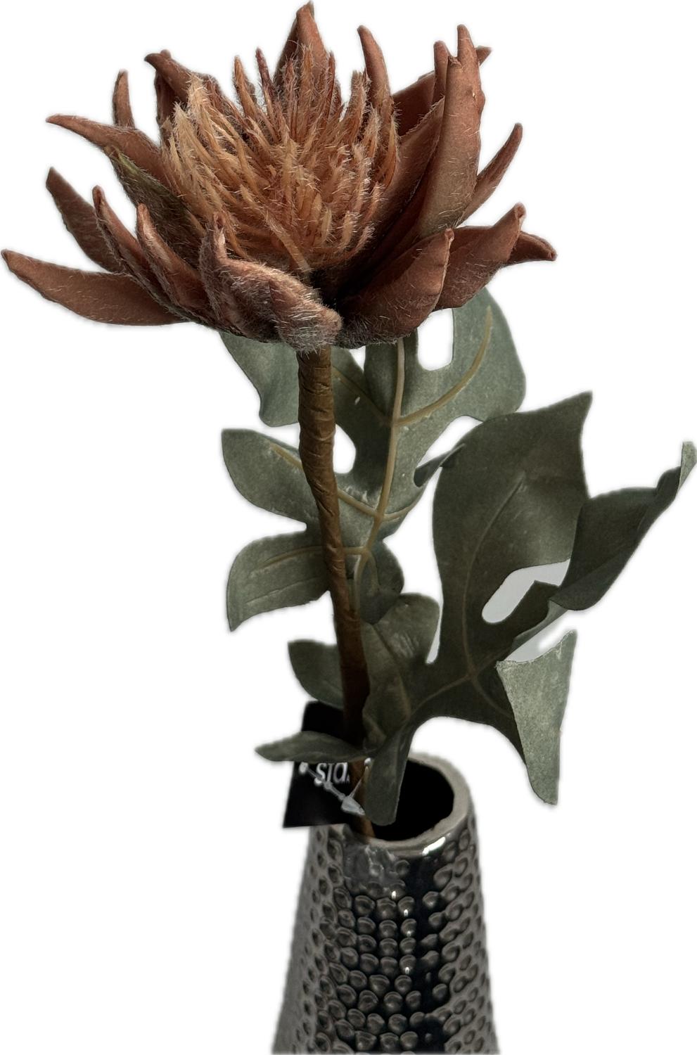 Tato umělá květina představuje sofistikovanou eleganci a nadčasový styl. Květ má jemně růžovo-hnědou barvu, což dodává květině přirozený vzhled a dojem realismu. Detaily jsou propracované, se sametovými okvětními lístky a tmavým, realistickým stonkem. Listy jsou sytě zelené a dodávají aranžmá živý vzhled