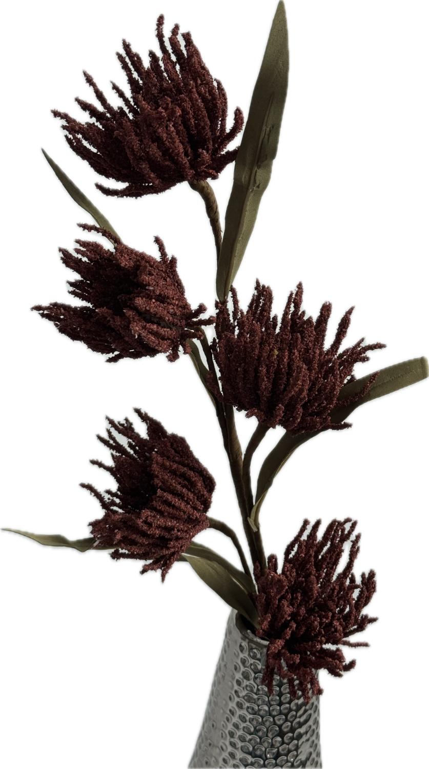 Tato umělá květina představuje originální a elegantní dekoraci, která přinese do vašeho interiéru nádech přírody. Květy mají jemné, teplé odstíny červených tónů, s bohatě strukturovanými okvětními lístky. Listy jsou v tlumené zelené barvě s jemnou texturou, doplňující přirozený vzhled
