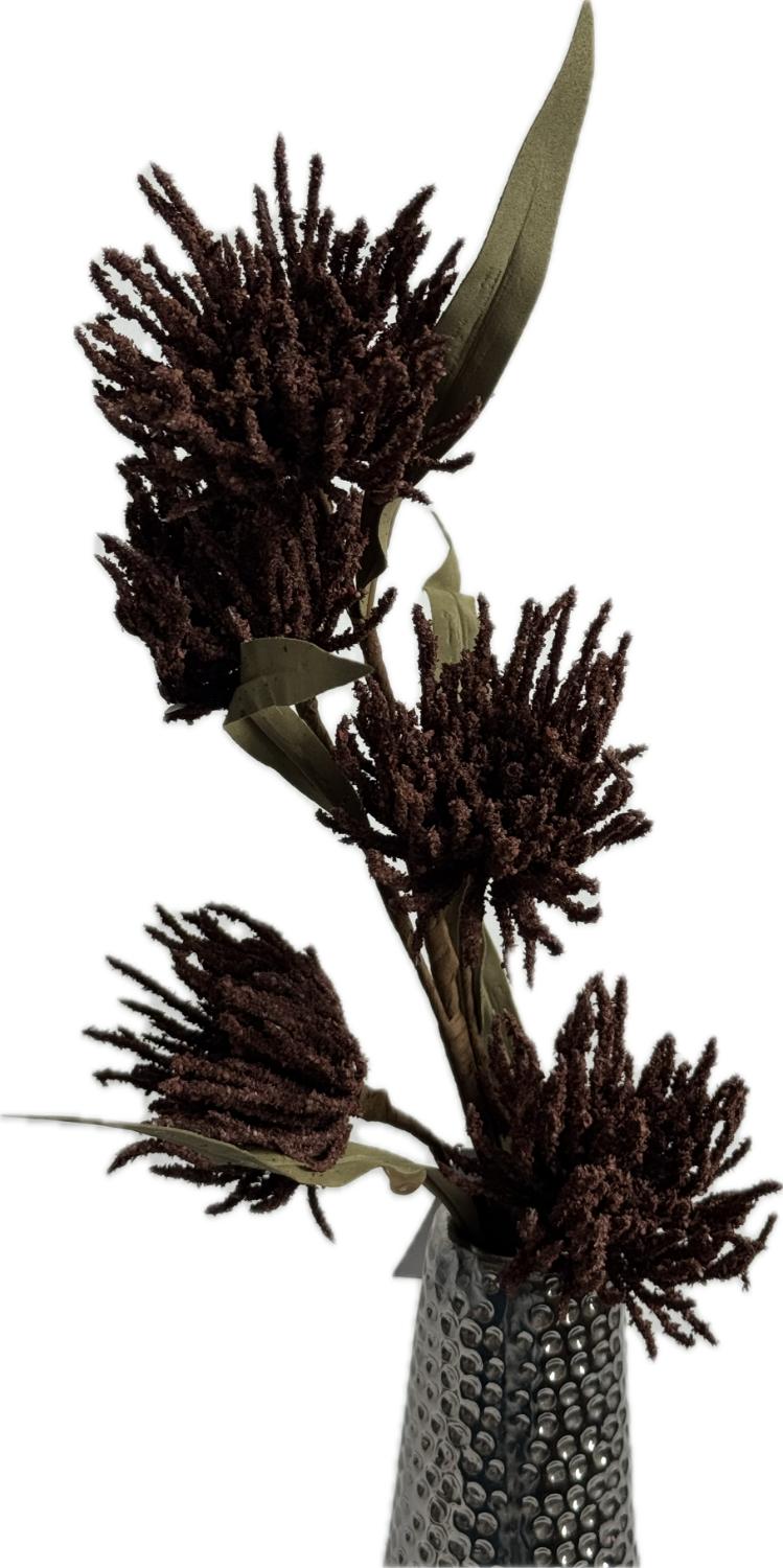 Tato umělá květina představuje originální a elegantní dekoraci, která přinese do vašeho interiéru nádech přírody. Květy mají jemné, teplé odstíny vínových tónů, s bohatě strukturovanými okvětními lístky. Listy jsou v tlumené zelené barvě s jemnou texturou, doplňující přirozený vzhled