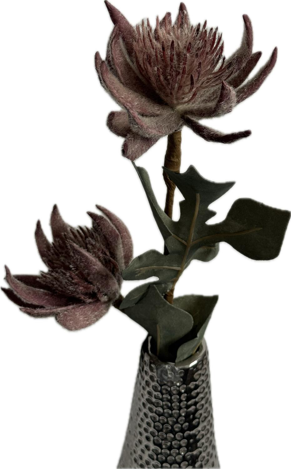Tato umělá květina představuje originální a elegantní dekoraci, která přinese do vašeho interiéru nádech přírody. Květ má jemné, teplé odstíny vínových tónů, s bohatě strukturovanými okvětními lístky, které působí jako zavadlé nebo suché květy. Listy jsou v tlumené zelené barvě s jemnou texturou, doplňující přirozený vzhled